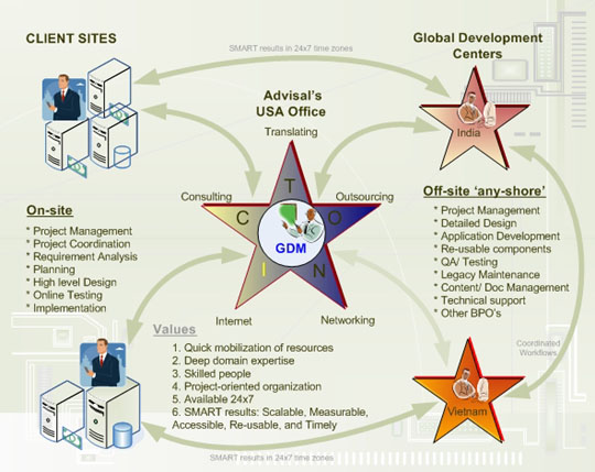 Leveraging the coordination from Advisal home office in the USA and the excellent support from its business partners, our Global Development Centers in India and Vietnam can offer End-to-End delivery across time zones. Staffed with IT professionals of highest caliber, Advisal Global Delivery Model provides strategic cost and time advantages for customers worldwide.